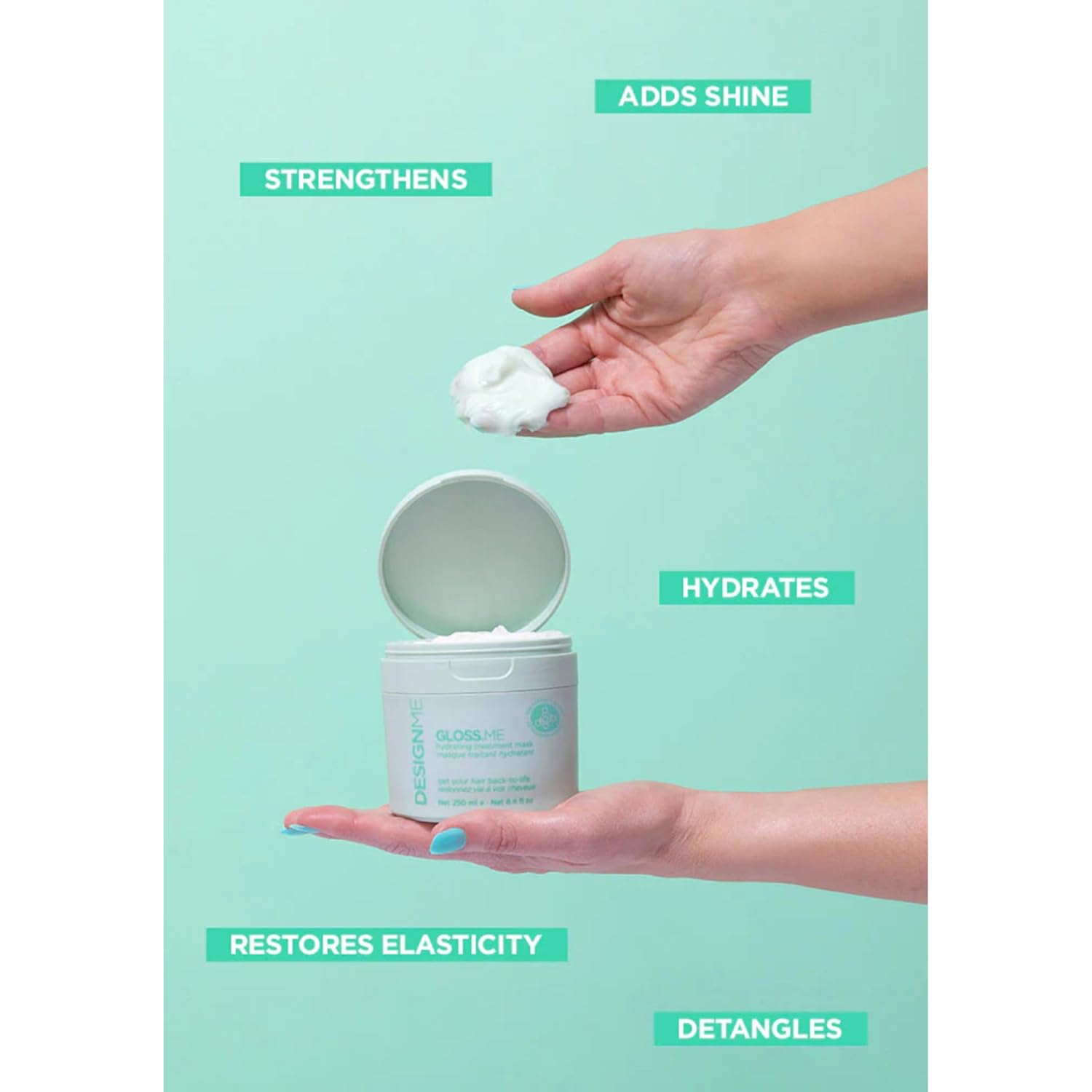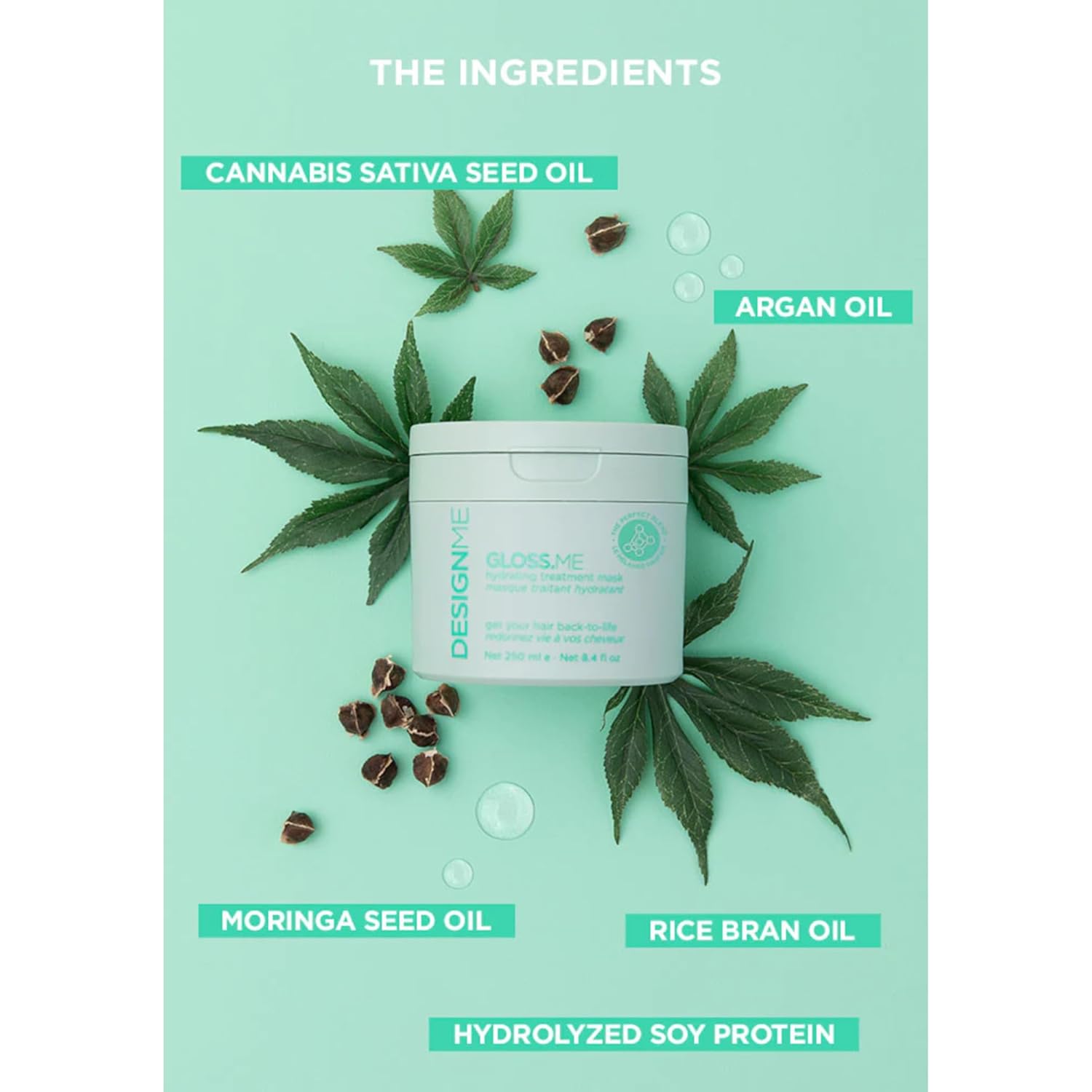 Revive dry, dull, or frizz-prone hair with DesignMe Gloss.Me Hydrating Treatment Mask. This luxurious, vegan cream mask is infused with a potent blend of hemp seed, moringa, argan oils, and hydrolyzed soy protein, delivering deep hydration, strength, and mirror-like shine. Ideal for all hair types—especially color-treated or compromised strands—it smooths, softens, and boosts elasticity in just five minutes.